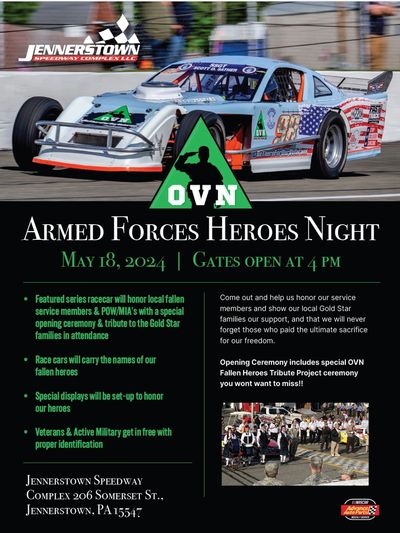 Operation Vet NOW Inc. (OVN) is once again partnering with Jennerstown Speedway to honor over 14 local fallen heroes, and bring out reach support services to our veterans! We hope to see you all 18 May Armed Forces Day at the track. Opening ceremony begins at 6:00PM Sharp!